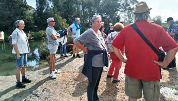 und Gräsern. Bei einem ruhigen und eindrücklichen Weiher machten wir einen Halt wo uns Max Böckli einiges über das Netz von Bewässerungsgräben und Kanälen, Quellen die aus unterirdischen Gewässer entstehen, der Vielfalt an Pflanzen und Vögel, deren Gesang uns während der Wanderung begleiteten, erzählte. Dann ging es durch eine wunderschöne Landschaft weiter zum Mittagessen im La Font Salada wo alle mit Speis und Trank in gemütlicher Runde auf ihre Kosten kamen. Die Font Salada ist eine Quelle mit kristallklarem Wasser wo man auch im Winter Baden kann bei einer Wasser Temperatur von 21° - 23°, zudem weist sie einen grossen Mineralien und Salzgehalt auf, das sehr gut ist für die Haut.